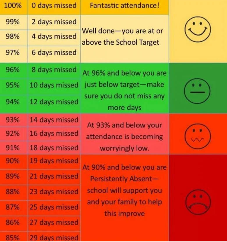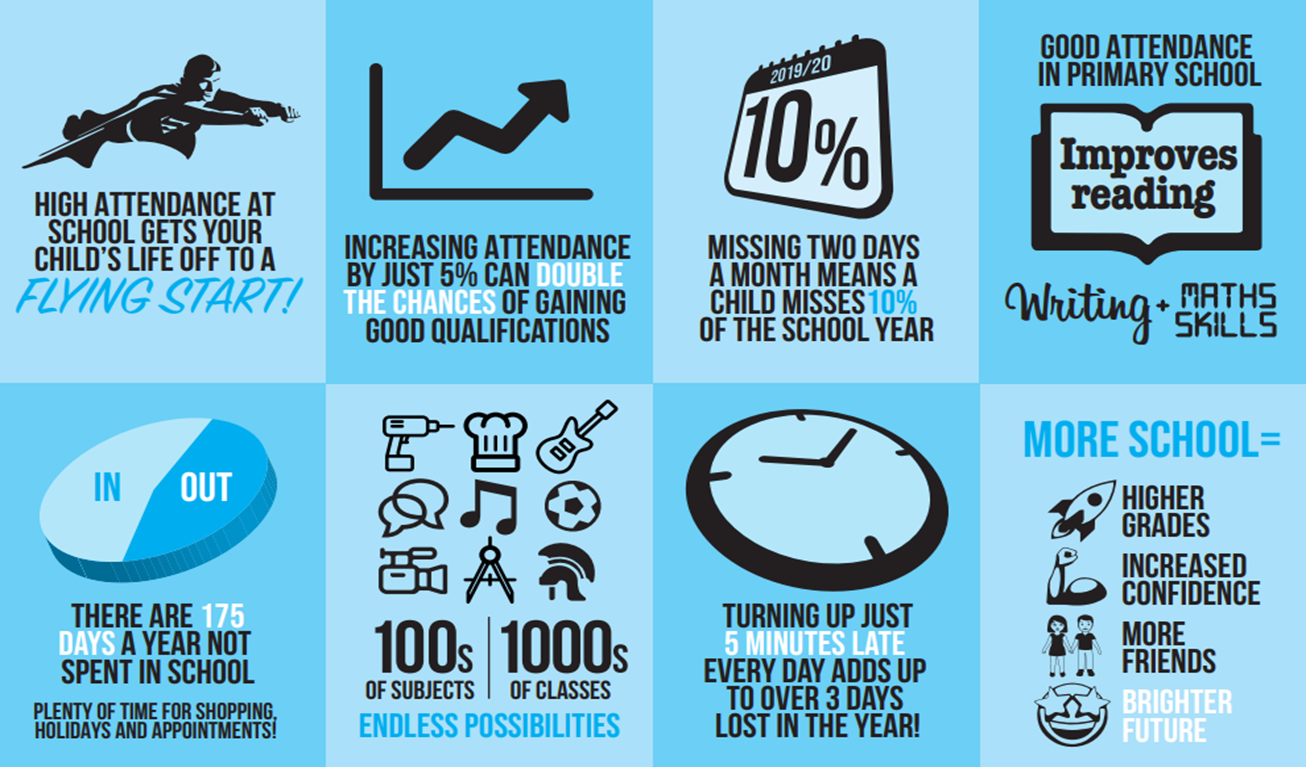 Poor attendance (and punctuality) not only impacts on a child’s progress and achievement but also on their self-esteem and well-being.